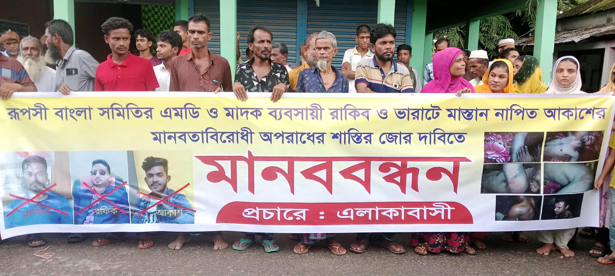 মানববন্ধনে বক্তারা রূপসী বাংলা সমিতির এমডি রাকিব, সহযোগী আকাশসহ জড়িতদের দ্রুত গ্রেপ্তার ও দৃষ্টান্তমূলক শাস্তির দাবি জানান।