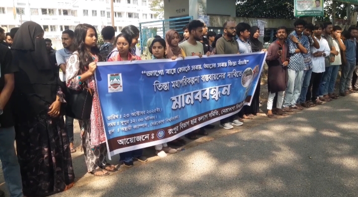 তিস্তা মহাপরিকল্পনা দ্রুত বাস্তবায়নের দাবিতে নেত্রকোণা বিশ্ববিদ্যালয়ে মানববন্ধন কর্মসূচি অনুষ্ঠিত হয়েছে।
