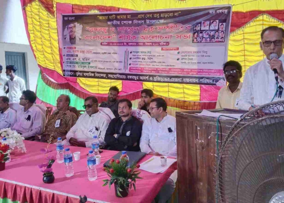 “আমার মাটি আমার মা… প্রান দেব তবু ছাড়ব না” জাতীয় শোক দিবস উপলক্ষে, বঙ্গবন্ধু ও সাম্প্রদায়িক সম্প্রীতির বাংলাদেশ ” শীর্ষক আলোচনা সভা হয়েছে। মঙ্গলবার (২২ আগস্ট) বিকালে বঙ্গবন্ধুর আদর্শ ও মুক্তিযুদ্ধের চেতনা বাস্তবায়ন পরিষদের সহযোগিতায় সদর উপজেলার মুলিয়া মাধ্যমিক বিদ্যালয়ের আয়োজনে বিদ্যালয় চত্বরে এ সভা অনুষ্ঠিত হয়। সভায় সভাপতিত্ব করেন মুলিয়া ইউনিয়ন পরিষদের চেয়ারম্যান ও মুলিয়া মাধ্যমিক বিদ্যালয় পরিচালনা কমিটির সভাপতি রবীন্দ্রনাথ অধিকারী।