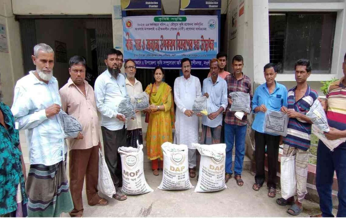 রাণীনগর (নওগাঁ) প্রতিনিধি: নওগাঁর রাণীনগরে কৃষি প্রণোদনার উপকরণ হিসেবে উপজেলার ৮টি ইউনিয়নের ক্ষুদ্র ও প্রান্তিক কৃষকদের মাঝে সার ও বীজ বিতরণ করা হয়েছে। বৃহস্পতিবার দুপুরে উপজেলা পরিষদ প্রাঙ্গনে উপজেলা কৃষি অফিস কর্তৃক আয়োজিত এক অনুষ্ঠানের মাধ্যমে ২০২৩-২৪অর্থবছরে খরিপ মৌসুমে মাসকালাই ও গ্রীষ্মকালীন পেঁয়াজ প্রণোদনা কর্মসূচির মাধ্যমে উৎপাদন বৃদ্ধির লক্ষ্যে ক্ষুদ্র ও প্রান্তিক কৃষকদের মাঝে বিনামূল্যে এই বীজ ও রাসায়নিক সার সরবরাহ করা হয়।