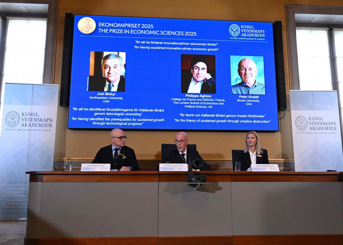 অর্থনীতিতে নোবেল পুরস্কার ২০২৫ পেলেন তিন বিশিষ্ট অর্থনীতিবিদ—ইসরায়েলি বংশোদ্ভূত মার্কিন নাগরিক জোয়েল মকিয়র, ফ্রান্সের ফিলিপ আগিয়োঁ এবং কানাডার পিটার হাউইট।
