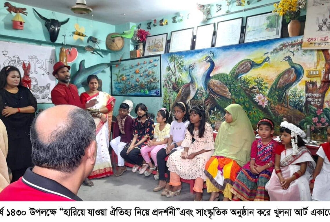 ৩০৮, শের-এ – বাংলা রোড,খুলনা। সকাল ৯ ঘটিকায় খুলনা আর্ট একাডেমির সকল সদস্যদের উপস্থিতিতে প্রতিষ্ঠাতা পরিচালক চিত্রশিল্পী মিলন বিশ্বাস উপস্থিত সকলকে ১৪৩০ বঙ্গাব্দের নববর্ষের শুভেচ্ছা জানায়। এবংঅনুষ্ঠানটি সুন্দরভাবে পরিচালনা করার জন্য সকল অভিভাবকদের কাছে সহযোগিতা কামনা করেন এবং উপস্থিত সকল অভিভাবকদের বলেন আপনারা শিশুুদের নিয়ে এ ধরনের সংস্কৃতি অঙ্গনে বিশেষ দিনে হারিয়ে যাওয়া ঐতিহ্য দেখালে তাদের জ্ঞান সমৃদ্ধ হবে।এরপরে খালিশপুর শিল্পাঙ্গন প্রতিষ্ঠানের পক্ষ থেকে দুইজন শিক্ষার্থী এবং প্রতিষ্ঠাতা পরিচালক সঞ্জয় সাহা খুলনা আর্ট একাডেমির প্রতিষ্ঠাতা পরিচালক চিত্রশিল্পী মিলন বিশ্বাসের হাতে একটি একতারা উপহার তুলে দেন। তখন চিত্রশিল্পী মিলন বিশ্বাস একতারাটি হাতে নিয়ে সকলের সামনে অনুভূতি প্রকাশ করেন। আজ এই উপহার পেয়ে আমি অনেক আনন্দিত। যদিও আমি একতারা বাজাতে পারি না তবে এখন থেকে আমি বাজাবার চেষ্টা করব। আর যদি আজ আমাকে এক লক্ষ টাকার চেক ও তুলে দিত আমি এতটা খুশি হতাম না। আমি তোমাদের আশীর্বাদ করি তোমরা অনেক বড় হও। সবাই এই অনুভূতি শুনে করতালির মাধ্যমে পরিবেশটি আরো সুন্দর করে তোলেন। তারপর সকলের পরিচিতি পর্ব শুরু হয়। পরিচিতি পর্বের পর হারিয়ে যাওয়া ঐতিহ্য যা বাঙালিরা এক সময় দৈনন্দিন সংসারে ব্যবহার করতো সেই বিষয়গুলি নিয়ে প্রদর্শনী প্রদর্শন করে। উপস্থিত সকল শিক্ষার্থীর হাতে এবং গালে রং দিয়ে আলপনা করে দেওয়া হয়। এতে নবীন শিক্ষার্থীরা খুব আনন্দ প্রকাশ করে।এখন ডিজিটালের দ্বারপ্রান্তে এসে অতীতের সকল স্মৃতি মুছে যায় ।আসলে আমাদের যে সকল বিষয়বলি দৈনন্দিন কাজে প্রয়োজন হয়ে থাকে তা আমরা নিচে বিস্তারিত তুলে ধরছি। হারিয়ে যাওয়া ঐতিহ্যঃ হারিকেন, পিতলের ল্যাম্প, কাঁচের ল্যাম্প, এগুলো গ্রামের আধার দূর করতো ।এই হারিকেন এবং ল্যাম্প এর মাধ্যমে গ্রামের মানুষরা পড়াশোনা করতেন এবং রাতের আঁধারকে দূর করতেন ।আজ নবীনদের কাছে এটি একটি অপরিচিত বিষয়।চিত্রশিল্পী মিলন বিশ্বাসের পিতার ব্যবহৃত পিতলের হুক্কা ও পিতলের ঘটি,এনালগ টেলিফোন,চিত্রশিল্পী মিলন বিশ্বাসের ব্যবহৃত বিষয়। এবং সংরক্ষণ করা অসংখ্য বিষয় যেমন পিতলের বদনা, গ্লাস,নারকেলের হুক্কা, কাঠের বিন বাশি, প্লাস্টিকের সাপ,তেল মাপা লিটার, সোলার তৈরি সারস পাখি, রাজকীয় মাটির তৈরি হাতি,ঘোড়া, মাটির পুতুল, মাটির সরা, মাটির প্রদীপ,লাউয়ের খোলস, বৈঠা, জোকার, বিভিন্ন ধরনের একতারার ভিতরে লালন, ঢেঁকি, কাঠের ঘর, কাঠের তৈরি গরু, হরিণের মাথা, গণেশের মাথা, মহিষের মাথা, বাঘের মাথা, হারিয়ে যাওয়া রেডিও, একতারা, বেতের তৈরি সের,গরুর শিংএর তৈরি কলমদানি, মাটির হাড়ি, কাঠের তৈরি লাটিম, মাছ ধরার পোলো, মাছ রাখা খাড়া, ক