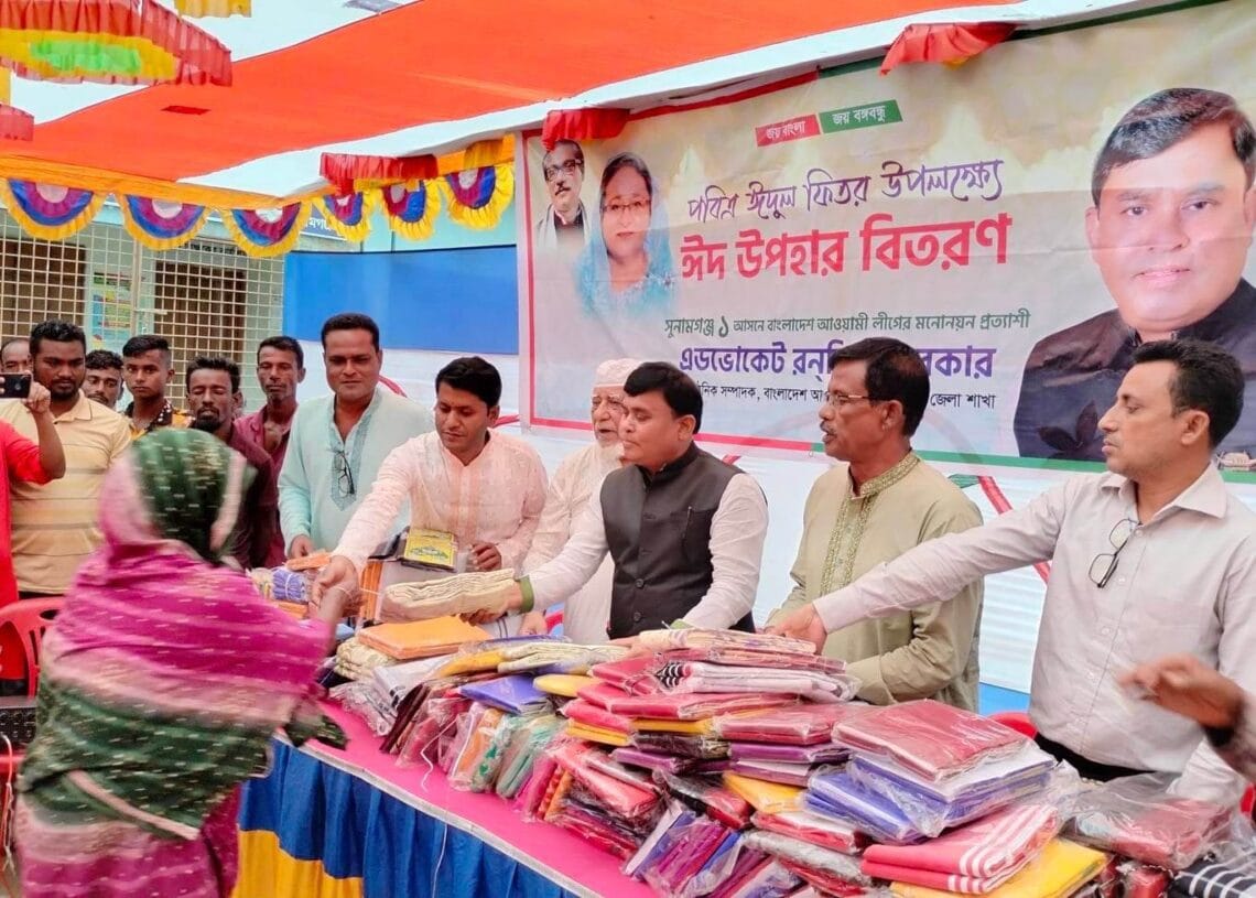 সুনামগঞ্জের তাহিরপুরে পবিত্র ঈদুল ফিতর উপলক্ষে ৫শতাধিক পরিবারের মাঝে ঈদ উপহার স্বরূপ শাড়ী লুঙ্গী বিতরণ করলেন অ্যাডভোকেট রনজিত সরকার।