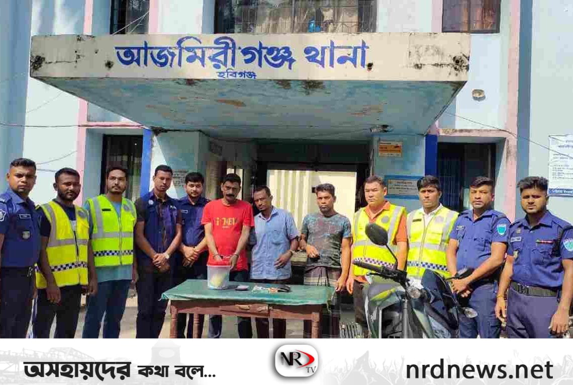 হবিগঞ্জ জেলা প্রতিনিধি ঃ আজমিরীগঞ্জ বণিক সমিতির সাধারণ সম্পাদক নিখিল বণিকের ছেলে আলোচিত ইয়াবা ব্যবসায়ী গৌতম বণিক সহ ৩ ব্যবসায়ী কে ৮৫ পিস ইয়াবা সহ আটক করছে আজমিরীগঞ্জ থানা পুলিশ। খোঁজ নিয়ে জানা যায়। আজমিরীগঞ্জ উপজেলায় ১৭ই মে রোজ বুধবার প্রায় দুপুর ১২.৩০ ঘটিকার সময় গোপন সংবাদের ভিত্তিতে আজমিরীগঞ্জ বাজারের ১টি দোকানে আজমিরীগঞ্জ থানার অফিসার ইনচার্জ মোঃ মাসুক আলী’র নেতৃত্বে একটি “টিম অভিযান চালায়। বাজারের ঐ দোকানে ইয়াবা সেবন এবং ক্রয়-বিক্রয়ের সময় আসামী ১। গৌতম কুমার বনিক (৪৯) পিতা- নিখিল চন্দ্র বনিক, গ্রাম- সরাপনগর (গঞ্জেরহাটি) ২। জুনায়েদ আহমেদ (৪৮) পিতা- নাছির উদ্দিন, গ্রাম- আজিমনগর (মুন্সিহাটি) ৩। আতাউর রহমান (৩৫) পিতা- মৃতঃ নুর উদ্দিন মিয়া, গ্রাম- শরীফনগর, । অভিযানের সময় বাজারের লোকজন জড়ো হয়। আসামীদের দেহ তল্লাশী করে তাদের দখল হইতে ৮৫পিস ইয়াবা ট্যাবলেট, ইয়াবা বিক্রয়ের নগদ ১০,৮০০/- টাকা এবং ইয়াবা বিক্রয়ের পরিবহনকাজে ব্যবহৃত আসামী গৌতম কুমার বনিক এর একটি হোন্ডা মটরসাইকেল জব্দ করা হয়। আসামিরা পূর্বেও মাদকের মামলায় জেল খাটে। আসামীরা পেশাদার মাদক কারবারী। গোপনে মাদক কারবার করলেও “টিম আজমিরীগঞ্জ থানার” জালে ধরা পড়ে এই মাদক কারবারীরা। বাজার ব্যবসায়ী সহ স্থানীয় লোকজন “টিম আজমিরীগঞ্জ থানার পুলিশ টিমকে ধন্যবাদ জানায় । আজমিরীগঞ্জ থানার অফিসার ইনচার্জ মোঃ মাসুক আলী এন আর ডি নিউজ কে জানান মাদক ও জুয়ার বিরুদ্ধে অভিযান অব্যাহত থাকবে। সবাইকে সচেতন ভুমিকা রেখে তথ্য দিয়ে পুলিশকে সহযোগিতা করার জন্য বিশেষ ভাবে আহবান জানান অফিসার ইনচার্জ মোঃ মাসুক আলী।