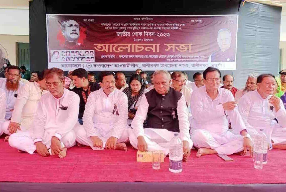 সকালে উপজেলা আওয়ামী লীগের আয়োজনে দলীয় কার্যালয়ের সামনে থেকে শোক র্যালি বের করা হয়। র্যালিটি সদরের প্রধান প্রধান সড়ক প্রদক্ষিণ করে। এরপর উচ্চ বালিকা বিদ্যালয় প্রাঙ্গনে আলোচনা সভা ও দোয়া মাহফিল অনুষ্ঠিত হয়। সভায় প্রধান অতিথি হিসাবে উপস্থিত ছিলেন, রাণীনগর উপজেলা আওয়ামী লীগের সভাপতি আনোয়ার হোসেন হেলাল এমপি।