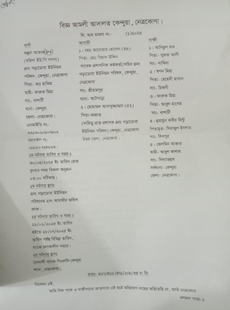 নেত্রকোনার কেন্দুয়া উপজেলার ৪নং গড়াডোবা ইউনিয়নের ৭, ৮ ও ৯ নং ওয়ার্ডের নির্বাচিত মহিলা সদস্য মনজুরা আক্তার একই ইউনিয়ন পরিষদের প্রশাসক মোহাম্মদ আসাদুজ্জামান ও সাবেক সচিব আনোয়ার হোসেনের বিরুদ্ধে জালিয়াতির অভিযোগে আদালতে মামলা দায়ের করেছেন।