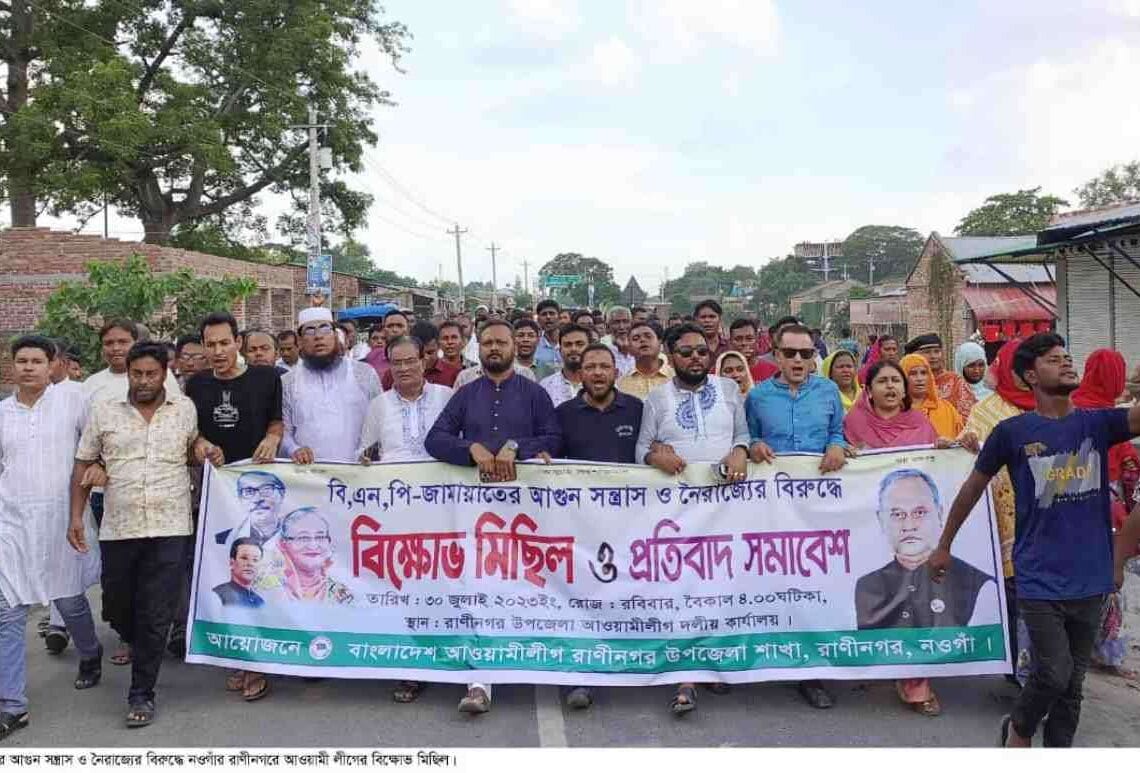 রাণীনগর (নওগাঁ) প্রতিনিধি: বিএনপি-জামায়াতের আগুন সন্ত্রাস ও নৈরাজ্যের বিরুদ্ধে নওগাঁর রাণীনগরে বিক্ষোভ মিছিল ও প্রতিবাদ সমাবেশ করেছে উপজেলা আওয়ামীলীগ। রবিবার বিকালে উপজেলা আওয়ামী লীগের আয়োজনে দলীয় কার্যালয়ের সামনে থেকে বিক্ষোভ মিছিল বের করা হয়।