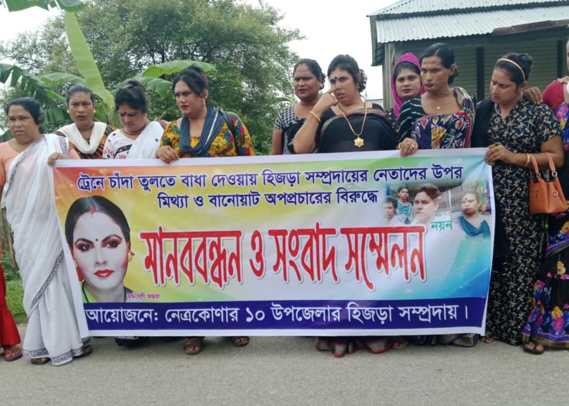 নেত্রকোণায় ট্রেনে চাঁদা তোলায় বাধা দেওয়ায় তৃতীয় লিঙ্গের নেতাদের বিরুদ্ধে মিথ্যা ও বানোয়াট অপপ্রচারের প্রতিবাদে মানববন্ধন ও বিক্ষোভ অনুষ্ঠিত হয়েছে।