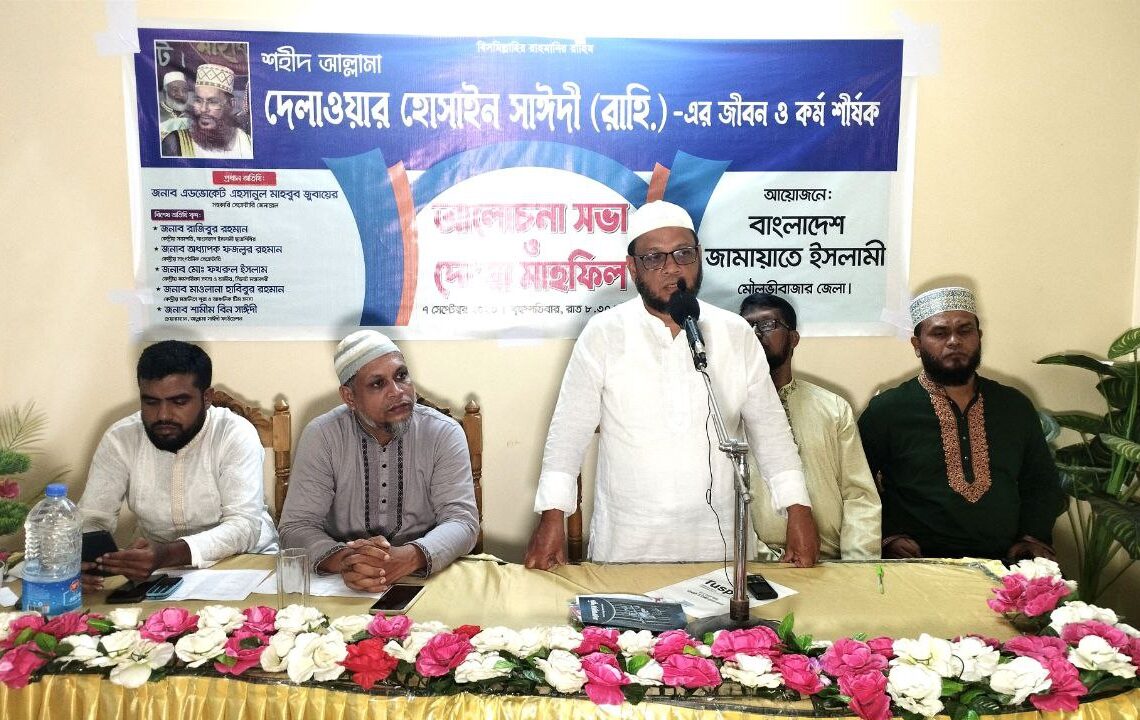 গতকাল ৭/০৯/২০২৩ইং বৃহস্পতিবার রাত ১১টায় মৌলভীবাজার সদর উপজেলার শাহবন্দর এলাকায় বিশ্বনন্দিত আলেমেদ্বীন ও মুফাসসিরে কুরআন মাওলানা দেলাওয়ার হোসাইন সাঈদীর জীবন ও কর্ম শীর্ষক ভার্চুয়াল আলোচনা সভা ও দোয়া মাহফিল থেকে সম্পূর্ন অন্যায়ভাবে জেলা জামায়াতের আমীর ইঞ্জিনিয়ার মোঃ শাহেদ আলী, সেক্রেটারী ইয়ামীর আলী, মৌলভীবাজার সদর উপজেলা জামায়াতের আমীর ফখরুল ইসলাম, মৌলভীবাজার পৌর জামায়াতের সেক্রেটারী মুর্শেদ আহমদ চৌধুরী ও মৌলভীবাজার জেলা জামায়াতের নেতা শেখ শাহাবুদ্দিনকে আটকের তীব্র নিন্দা, প্রতিবাদ ও অবিলম্বে জামায়াত নেতাদের মুক্তির দাবি জানিয়েছেন বাংলাদেশ জামায়াতে ইসলামী মৌলভীবাজার জেলা শাখার ভারপ্রাপ্ত আমীর মাওলানা আব্দুর রহমান।